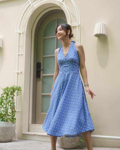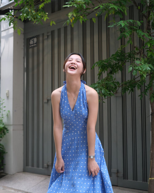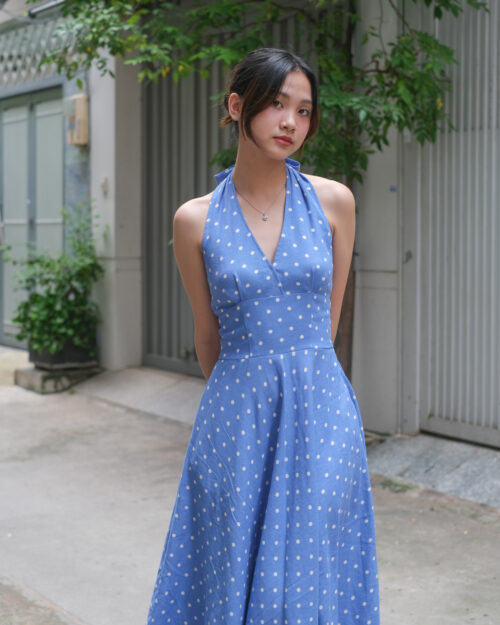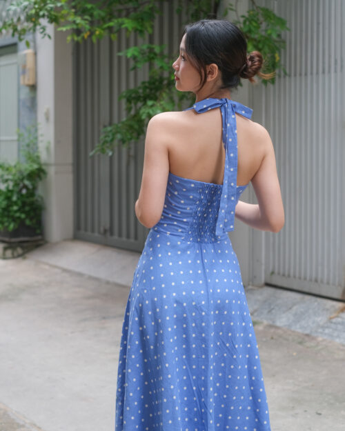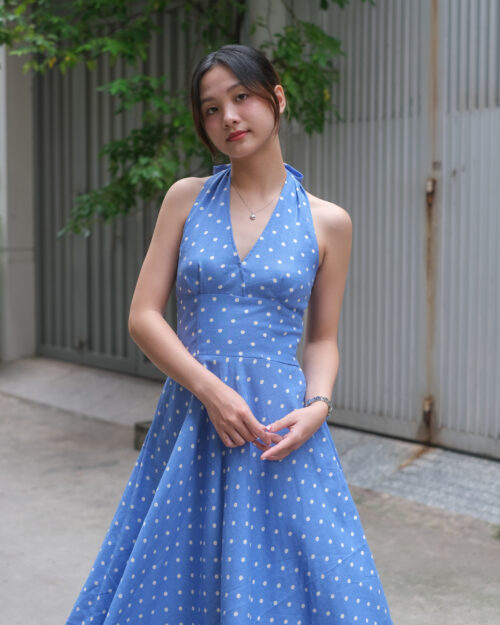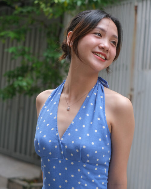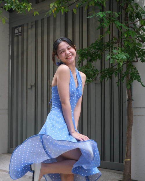 Phần cúp ngực được may ôm sát tinh tế. Phần eo được đẩy lên cao tạo cảm giác rất là thon gọn. Sau lưng Tẻn chạy thun để form đầm ôm vừa vặn nhứt. Tùng váy được cắt xéo – xoè tự nhiên tha hồ mà tung bay. Chiếc đầm này diện khi hội hè là tuyệt nhất!