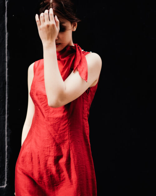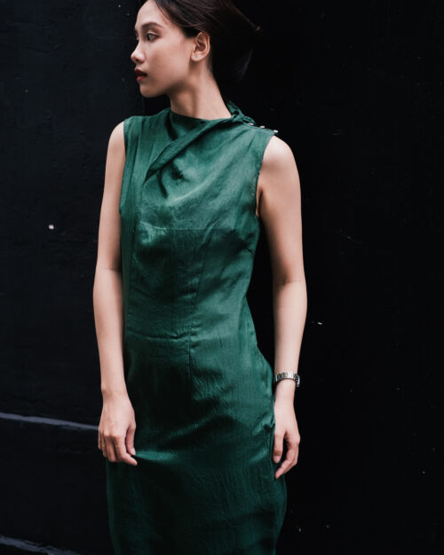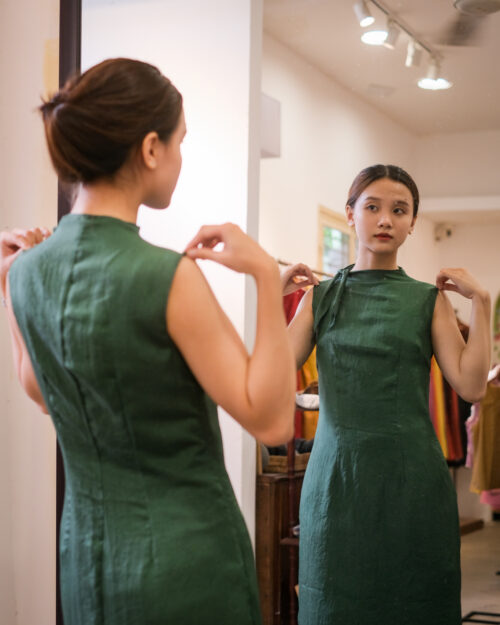 Đầm chất voan tơ – Kèm đầm lót 2 dây vải đũi rêu bên trong.
