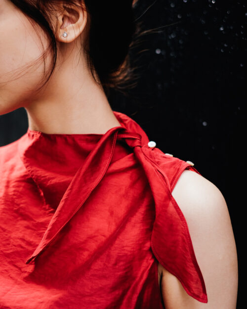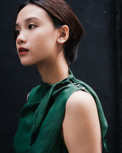Chiếc đầm lấy cảm hứng từ những cánh hoa rơi dịu dàng, điểm nhấn phần cổ áo với những chiếc nút xà cừ nhỏ rất duyên.
