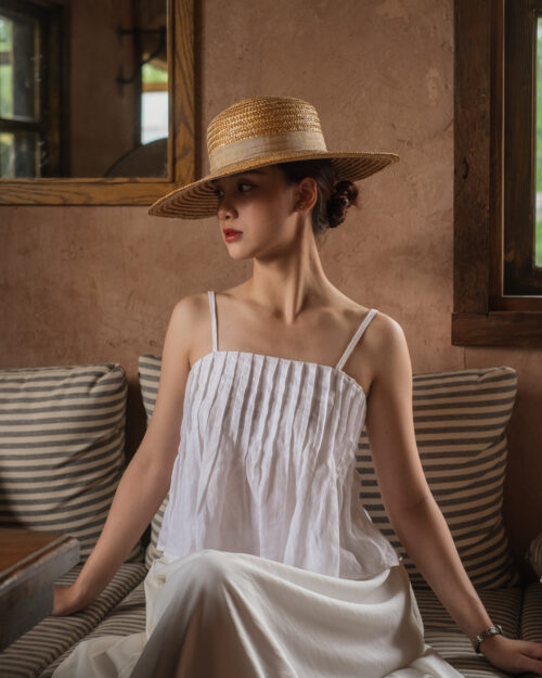 Những nếp gấp pli thủ công luôn làm Tẻn say mê. Form áo hai dây tôn dáng này là must have cho mùa hè.